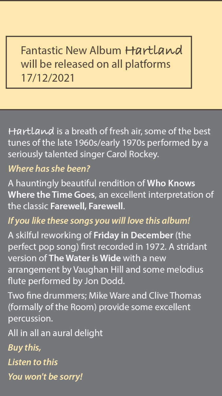 CELADORE RECORDS are proud to announce the release of 'HARTLAND' Carol Rockey's stunning new album........